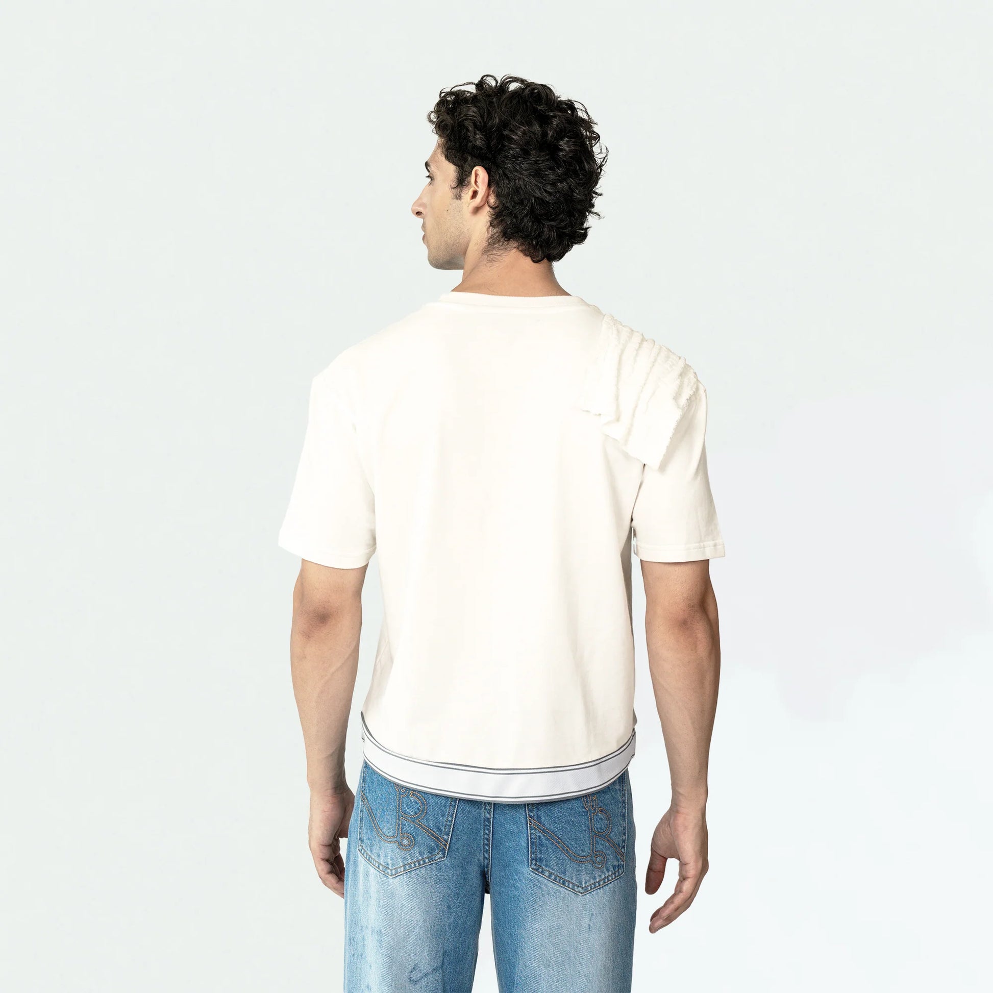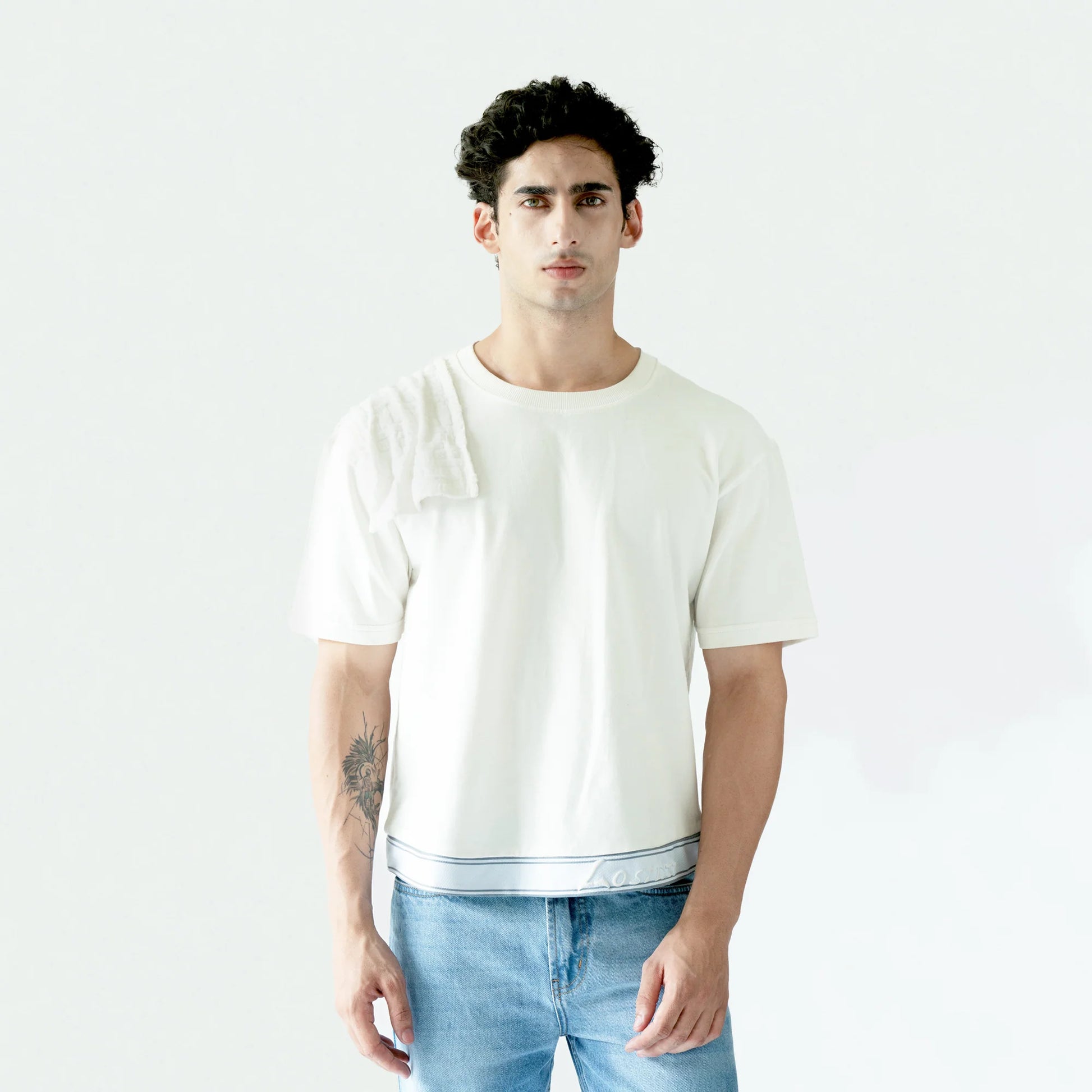 The Towel-Panel T-Shirt is a premium cotton T-shirt designed to balance structure and fluidity for a refined, contemporary everyday silhouette. Featuring a distinctive towel-knit shoulder panel and a tonal waist belt, this elevated essential introduces tactile contrast and subtle form definition while maintaining ease and comfort.